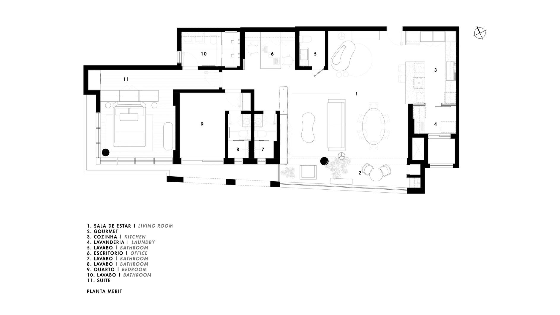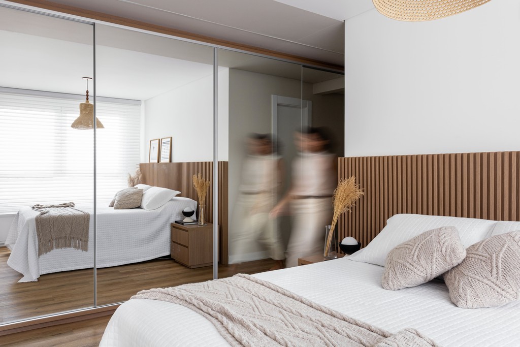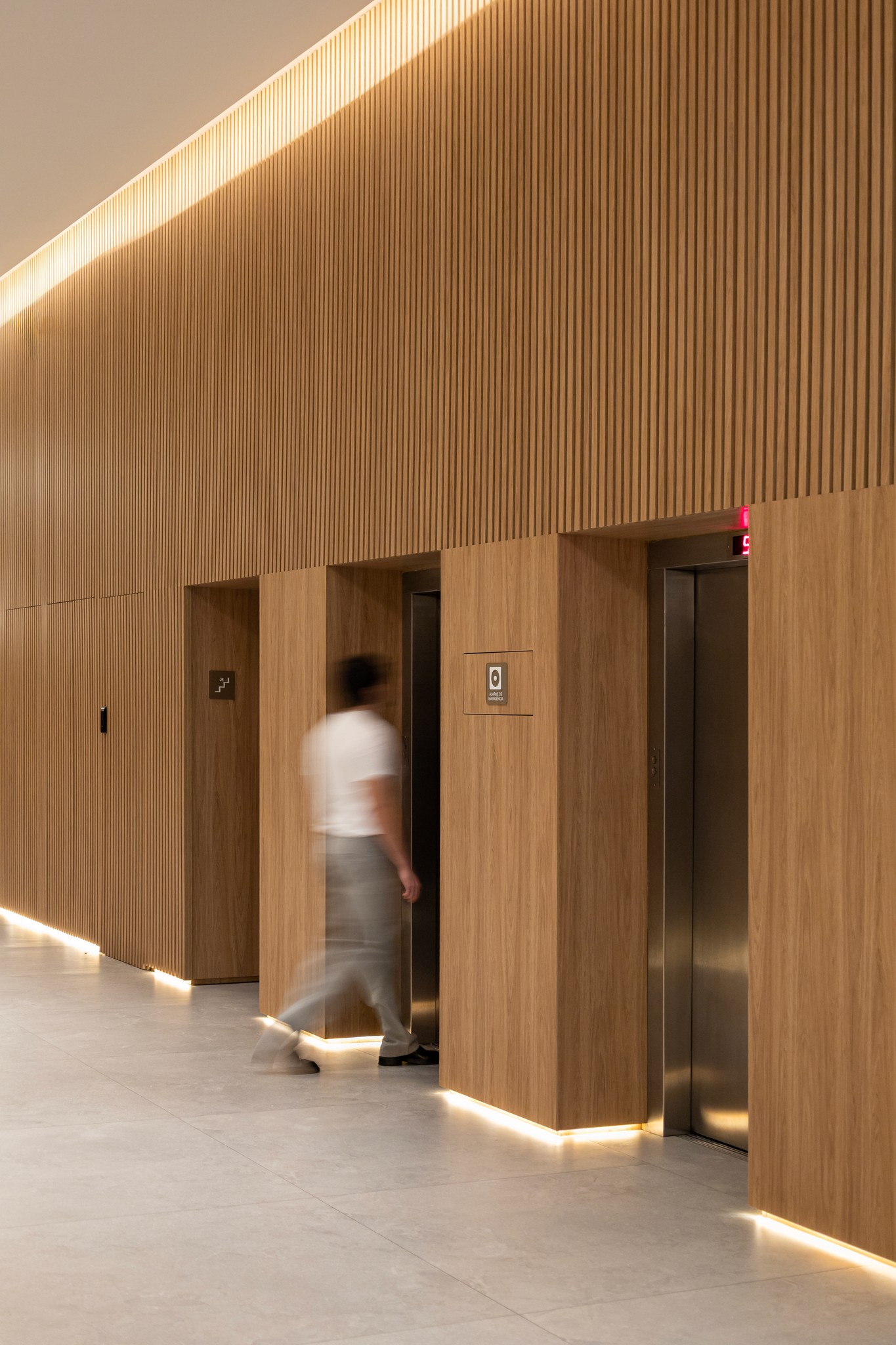 As curvas do projeto são enfatizadas pelos painéis ripados de marcenaria, que conduzem o olhar e o percurso até os elevadores. Esses elementos cumprem também um papel funcional ao integrar e disfarçar as portas de serviço, garantindo unidade visual ao extenso hall de circulação. O grid surge como um elemento-chave do projeto, emoldurado sob diferentes perspectivas e conferindo ritmo e personalidade ao espaço.
