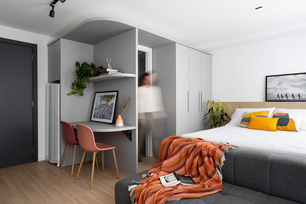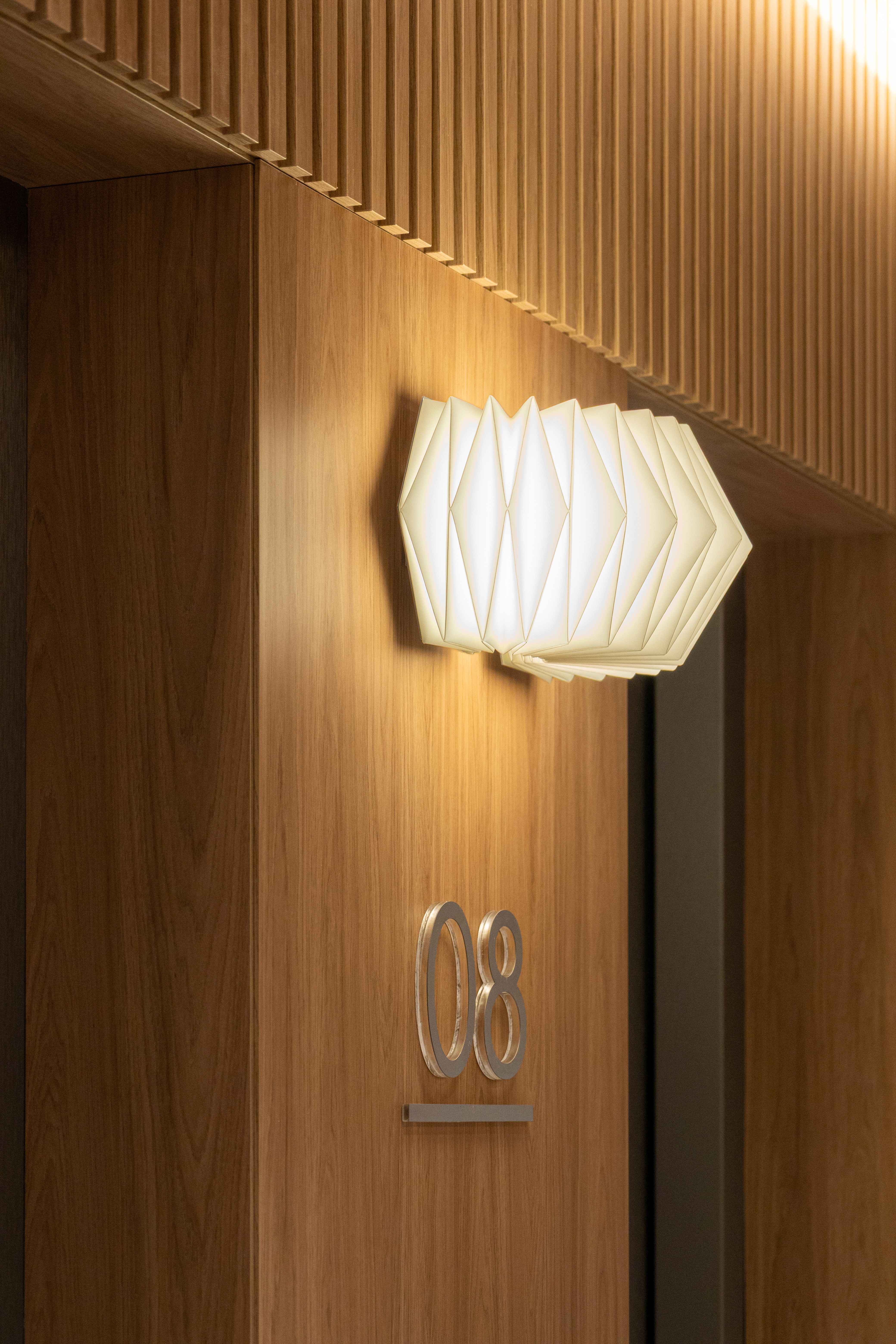 No hall principal, a bancada em marmofrost, com aspecto de pedra bruta, concentra de forma precisa todas as funções da recepção, assumindo um papel central na composição. Em contraste, as luminárias Disco, assinadas pela designer Mel Kawahara, flutuam no espaço com delicadeza, evocando dobraduras de papel e introduzindo uma sensação de leveza quase etérea ao conjunto.