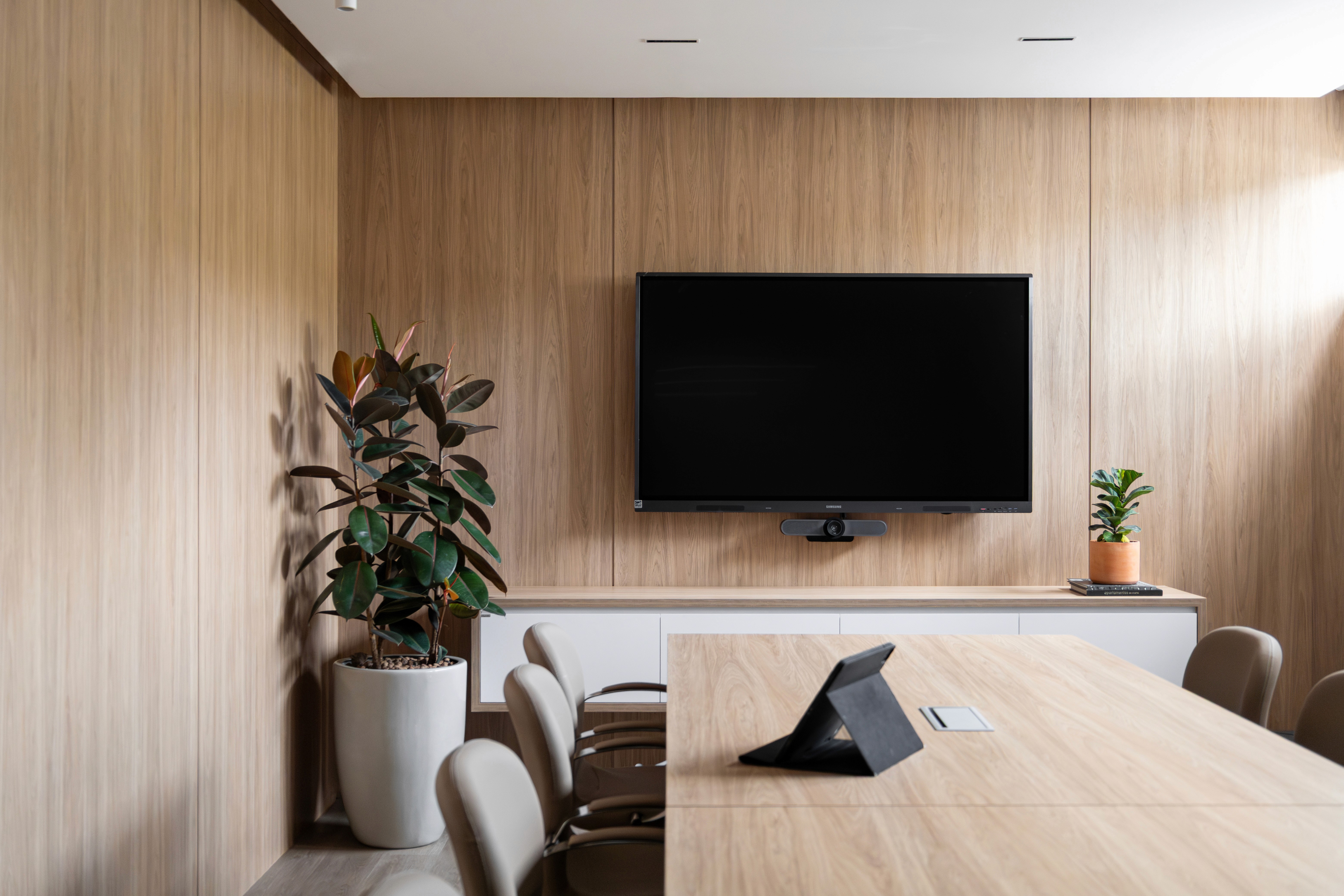 Outro ponto fundamental da intervenção foi a revitalização completa da sala de reuniões. O espaço foi integralmente reformulado para acompanhar a nova identidade do projeto, tanto em termos estéticos quanto funcionais.